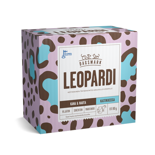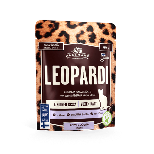 UutuusLoppuunmyytyCollectionKotimaiset kissan märkäruoatDagsmark LEOPARDI kana-nauta hyytelössä | SÄÄSTÖLAATIKKO