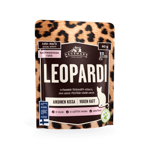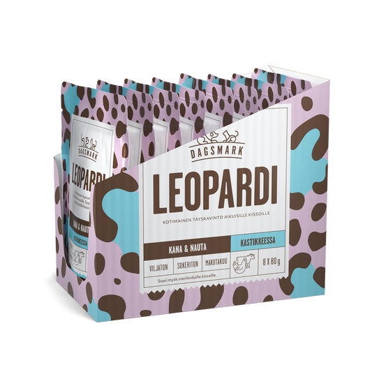 UutuusLoppuunmyytyCollectionKotimaiset kissan märkäruoatDagsmark LEOPARDI kana-nauta hyytelössä | SÄÄSTÖLAATIKKO